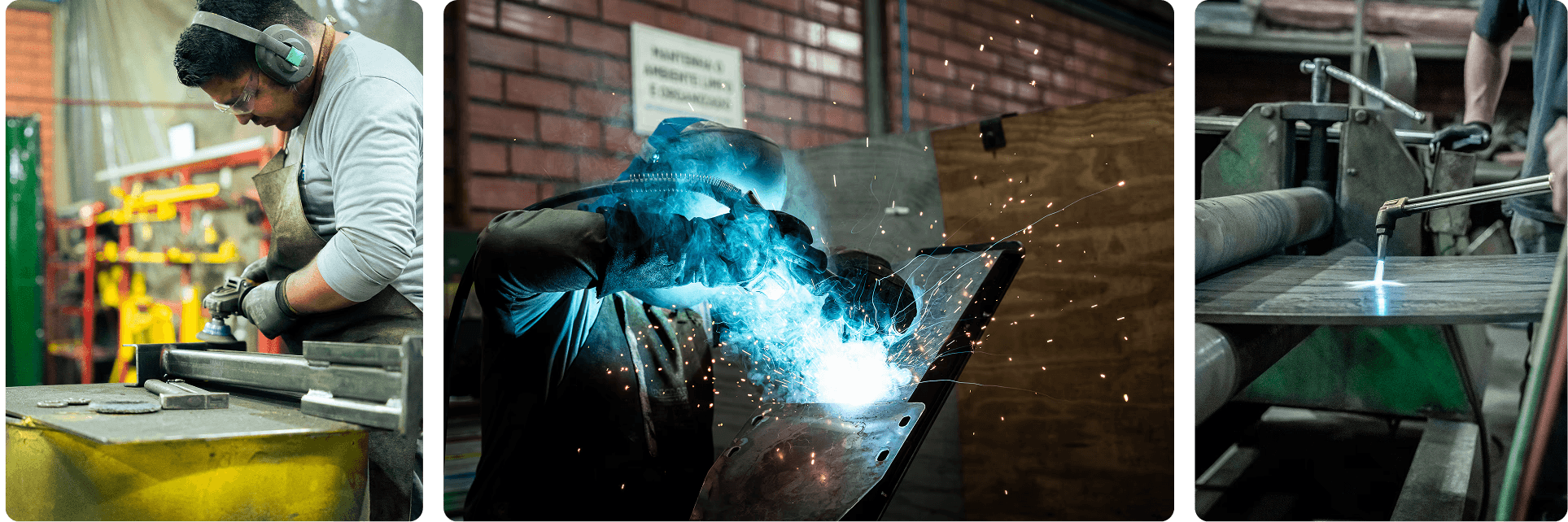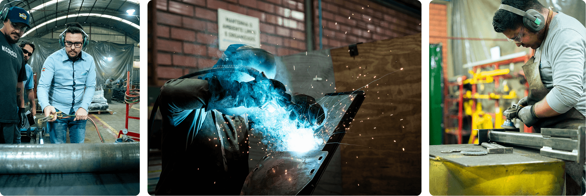 Etapas de corte, dobra, solda e pintura conduzidas com padronização e controle de qualidade.